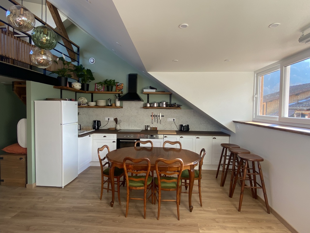Le logement dispose d’une chambre avec lit double, d’un canapé convertible en lit double dans le salon, et d’une banquette convertible en lit double sur la mezzanine, vous pouvez donc y dormir confortablement jusqu’à 6 personnes ! L’appartement est très lumineux, avec des grandes baies vitrées donnant sur les montagnes et sur la place de l’église, il propose des prestations haut de gamme : comptoirs en noyer, travertin, chauffage au sol, vidéoprojecteur, volets roulants électriques, lave-vaisselle, etc…