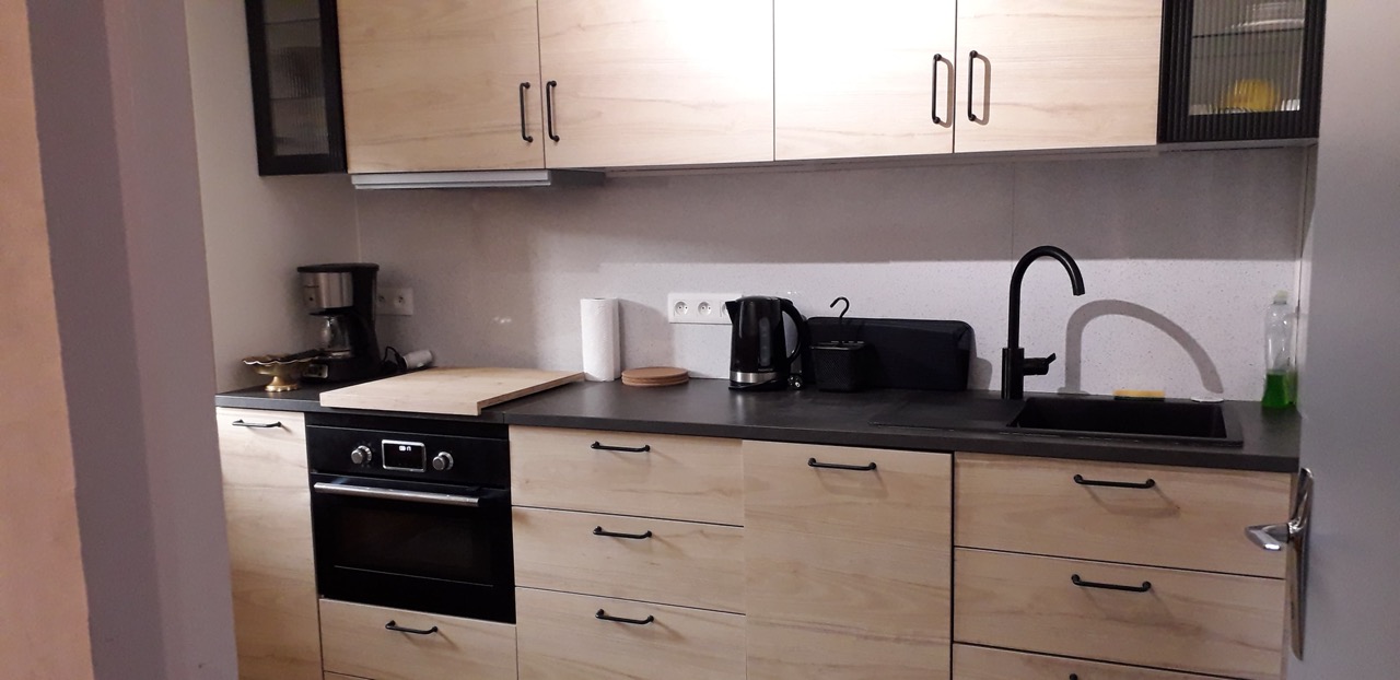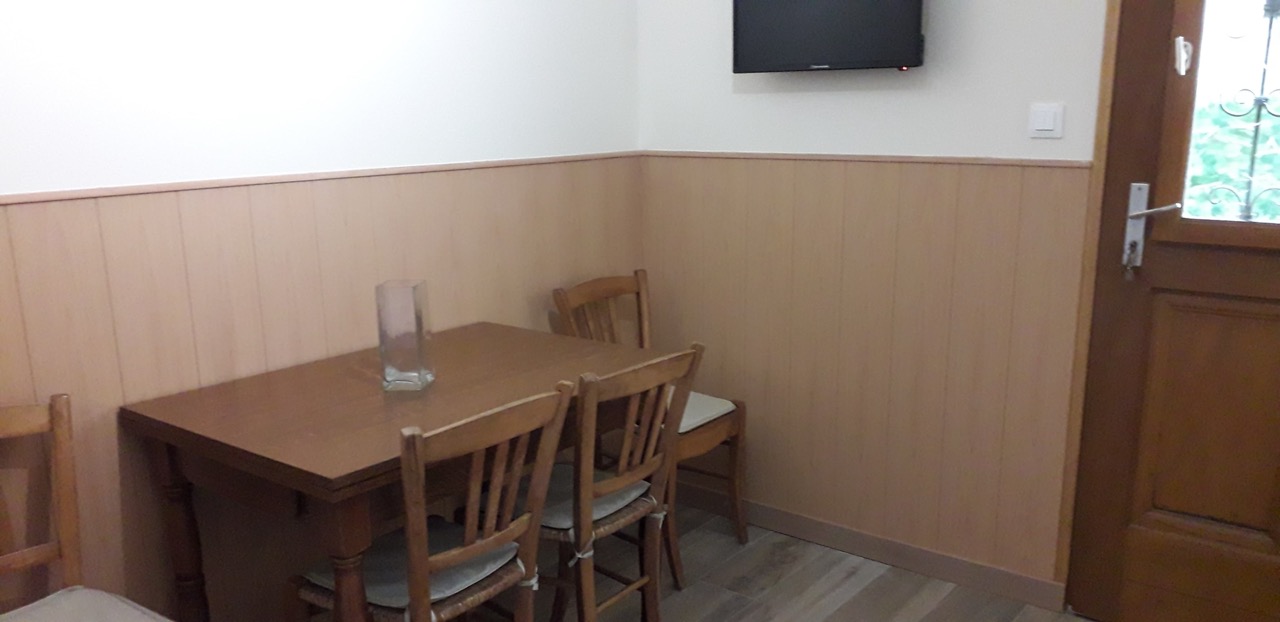 - Equipement de cuisine: cuisine intégrée, évier, frigo, congélateur, plaque à induction 2 feux, lave-vaisselle, four/micro-ondes, table, chaises, vaisselle, cocotte-minute, cafetière, etc…