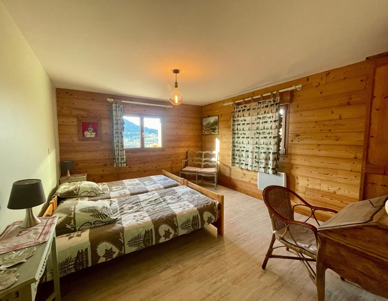 Chambre 1 : 2 lits jumeaux 90×190, lits équipés de couettes, fauteuils, bureau secrétaire, 2 fenêtres, radiateur.