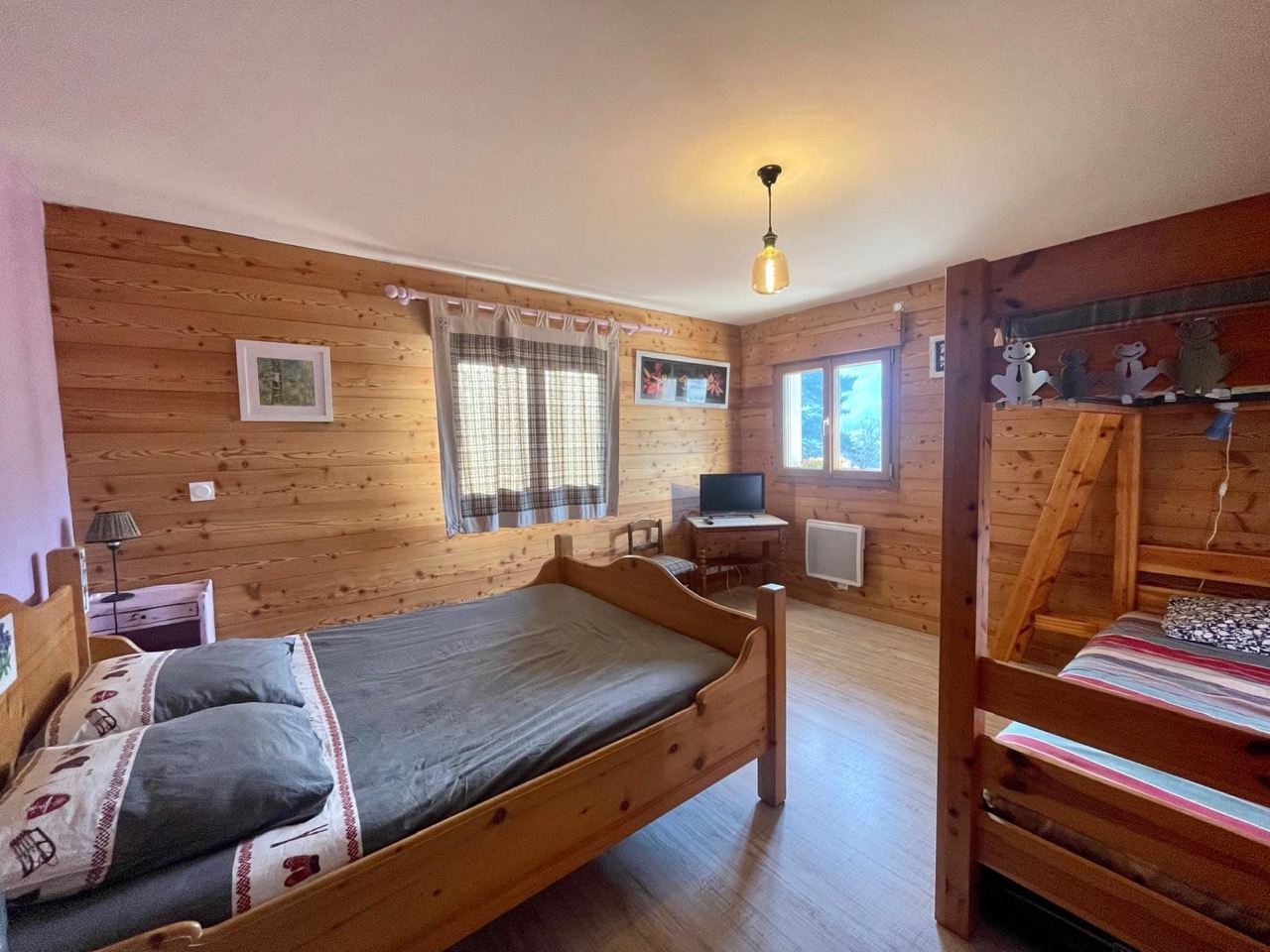 Chambre 2 : 1 lit 2 personnes 140×190, 2 lits superposés 90×190, lits équipés de couettes, TV, 2 fenêtres, radiateur.