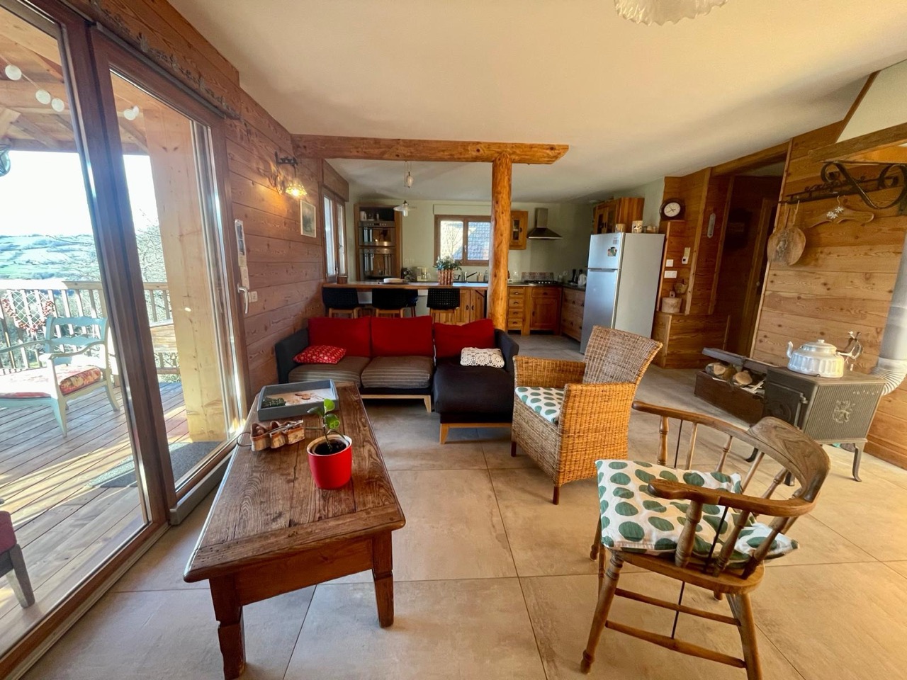 Vous disposerez d’une vaste pièce de vie ouvrant sur la terrasse couverte en bois de 20 m2, avec vue panoramique sur un grand terrain arboré et fleuri.